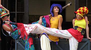 mimespelers en trommelaars, het is een bonte stoet mannen en vrouwen, die met