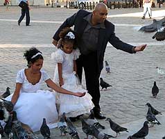 de talloze duiven en er stopt zelfs een limousine met daarin een bruidspaar dat