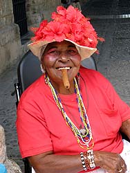 een vrouw in een rolstoel, die met haar grote Cubaanse sigaar van wel